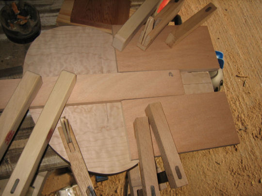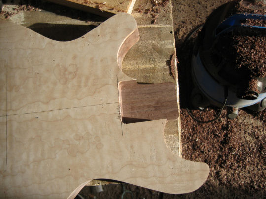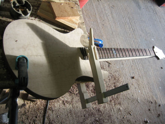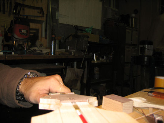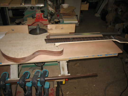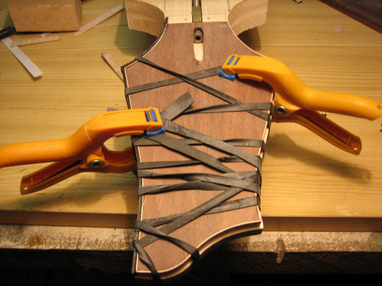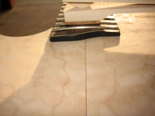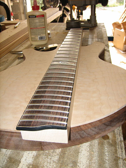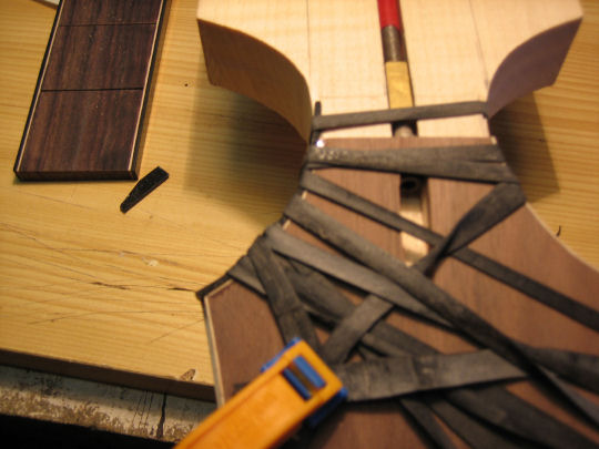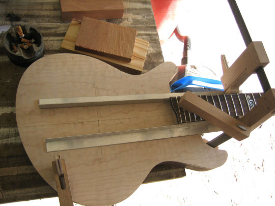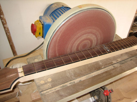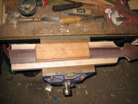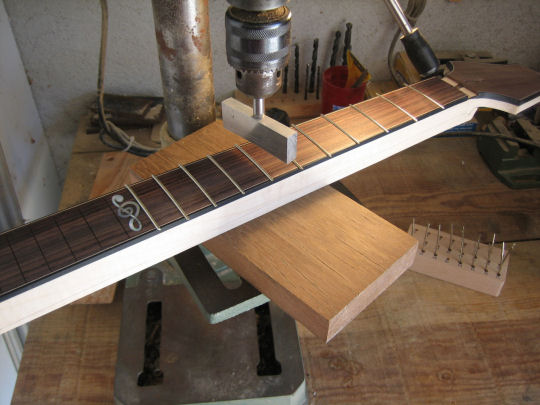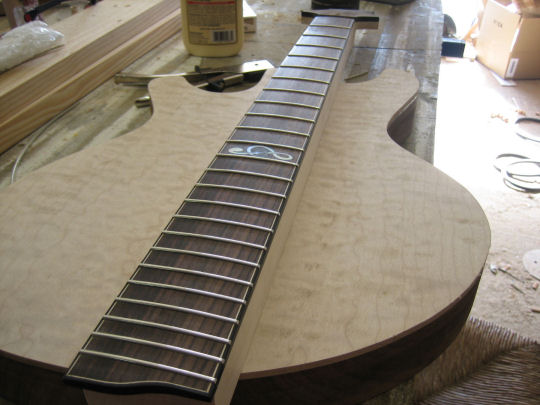 Au programme : Collage des filets de tête, Collage de la touche, radiussage, pose des frettes et découpe du manche.